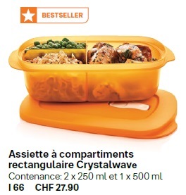 I 066 Assiette à compartiments rectangulaire Crystalwave – 1 L – 2x 250 ml + 1x 500 ml – CHF 27.90 – Lien catalogue page 63