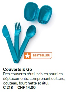 C 218 Couverts & Go – cuillère + couteau + fourchette + étui – CHF 14.00 – Lien catalogue page 63